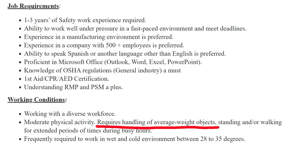 The demands from this job posting don’t offer potential new team members a clear idea of what will be expected of them physically. If you include a post-offer pre-employment testing process, including the demands in your job postings as well as in materials handed out during the hiring process help to make sure that new hire candidates are not testing for unexpected physical demands.