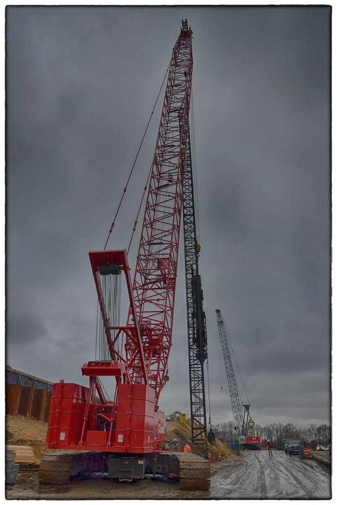 The photograph at the top of this blog was taken when we were leaving the worksite where laborers were building a new interchange where three highways merge together. The dockworkers who were operating the crane were installing 50 ton pilings that would eventually support the roof of a tunnel. When I took this image, we were in our vehicle and on the actual highway that was still in operation but below the job site. It looks as if the crane is precipitously close to an inclined surface where backing up a little bit could be disastrous.